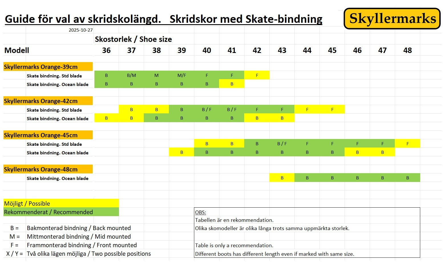 The blades curve and nose is the same as on our model Red 45cm. Lengthwise, there are two positions for the binding. Orange 45cm is best suited for shoe sizes 42-47. It will also work with smaller sizes if you desire a longer skate.